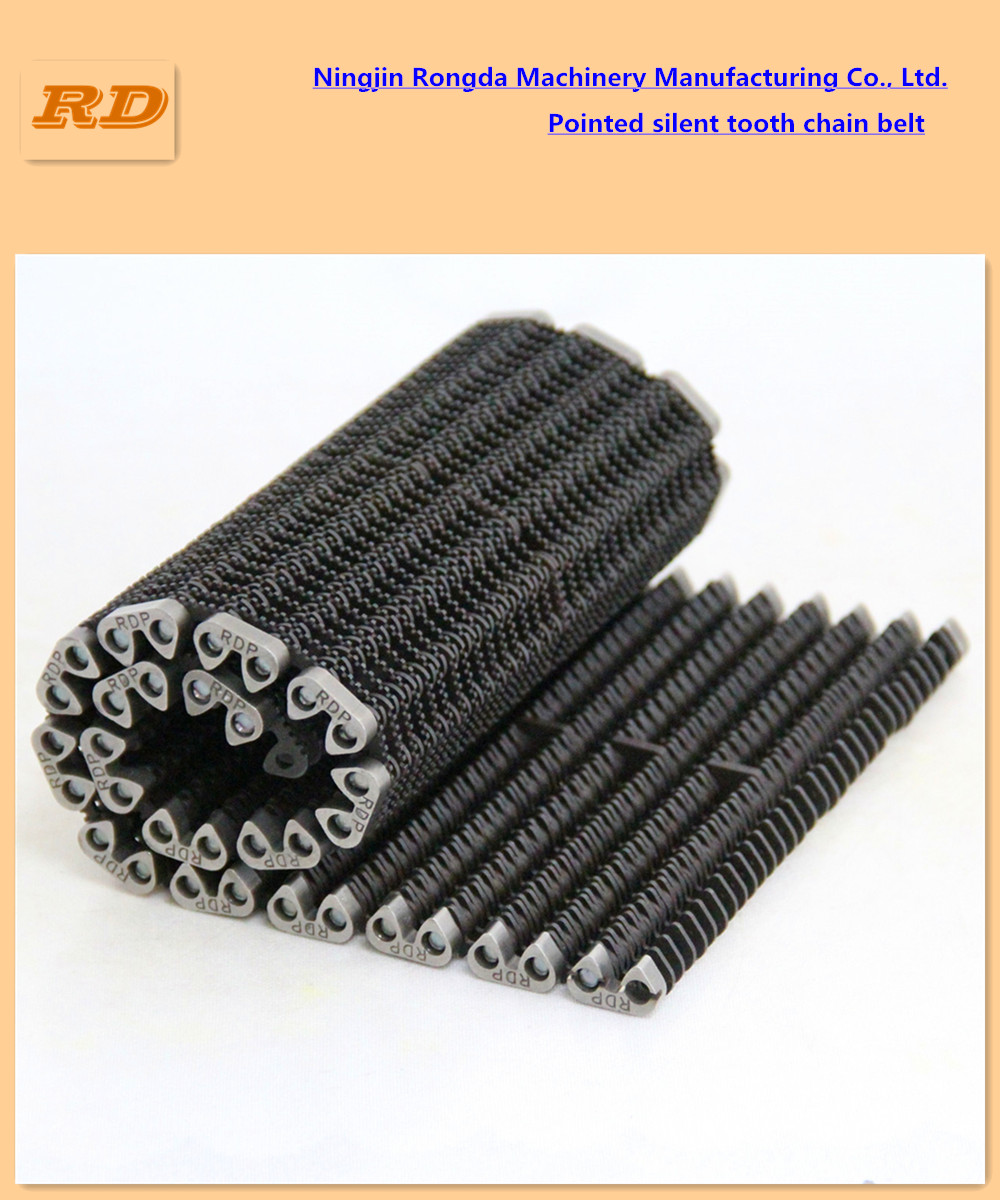Toothed chain belt is also called silent chain belt. Through special heat treatment process, it solves the problem that the heat treatment is not up to standard, which is common in China. The chain piece is forged by special steel strip with heat treatment thickness of 0.2mm. The outer layer is hard and the inner part is soft, which solves the problems of fragmentation and non abrasion, and prolongs the service life (it can be used for 3-5 years under normal conditions). Ningjin Rongda Machinery Manufacturing Co., Ltd. has been producing tooth chain belt for more than 30 years, which is the most complete enterprise in China. Our toothed chain is purchased by agents and glassware manufacturers all over the country every year. It is widely used in row and column machines and bottle conveying machines. Every product is sold after 24-hour operation to ensure the quality. If there are problems in the process of use, there are professional and technical personnel to the scene to solve.