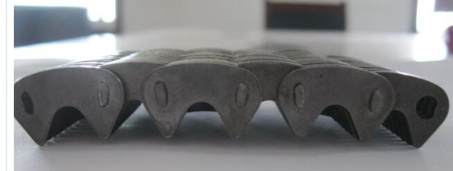 無聲傳動(dòng)鏈的鏈節(jié)形狀,以減少壓力集中的程度,延長疲勞壽命,增強(qiáng)鏈節(jié)的抗拉強(qiáng)度。創(chuàng)新的沖壓技術(shù)使每個(gè)鏈節(jié)的承壓面積得到大化。承壓面積的增加使得鏈接處的壓力減小,極大地降低了鏈條在使用過程中的拉長率。所有的鏈節(jié)都經(jīng)過拋丸處理以增加疲勞強(qiáng)度,并獲得一致的表面效果。