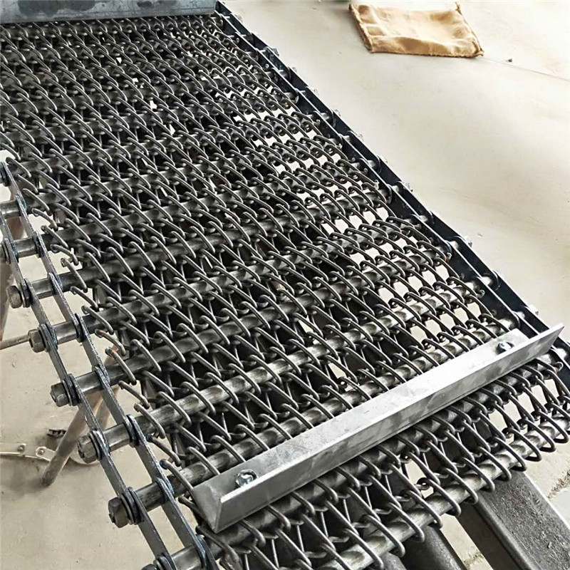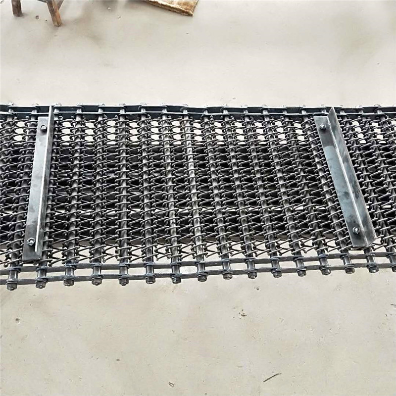 材質碳鋼,鏈條節(jié)距:50.8mm,小滾子,鏈條中心距離400mm,滾子直徑15.88mm,絲徑4mm,帶橫擋板,橫擋板采用40角鐵,間距600mm,網帶支軸軸頭采用螺絲固定,在焊上。