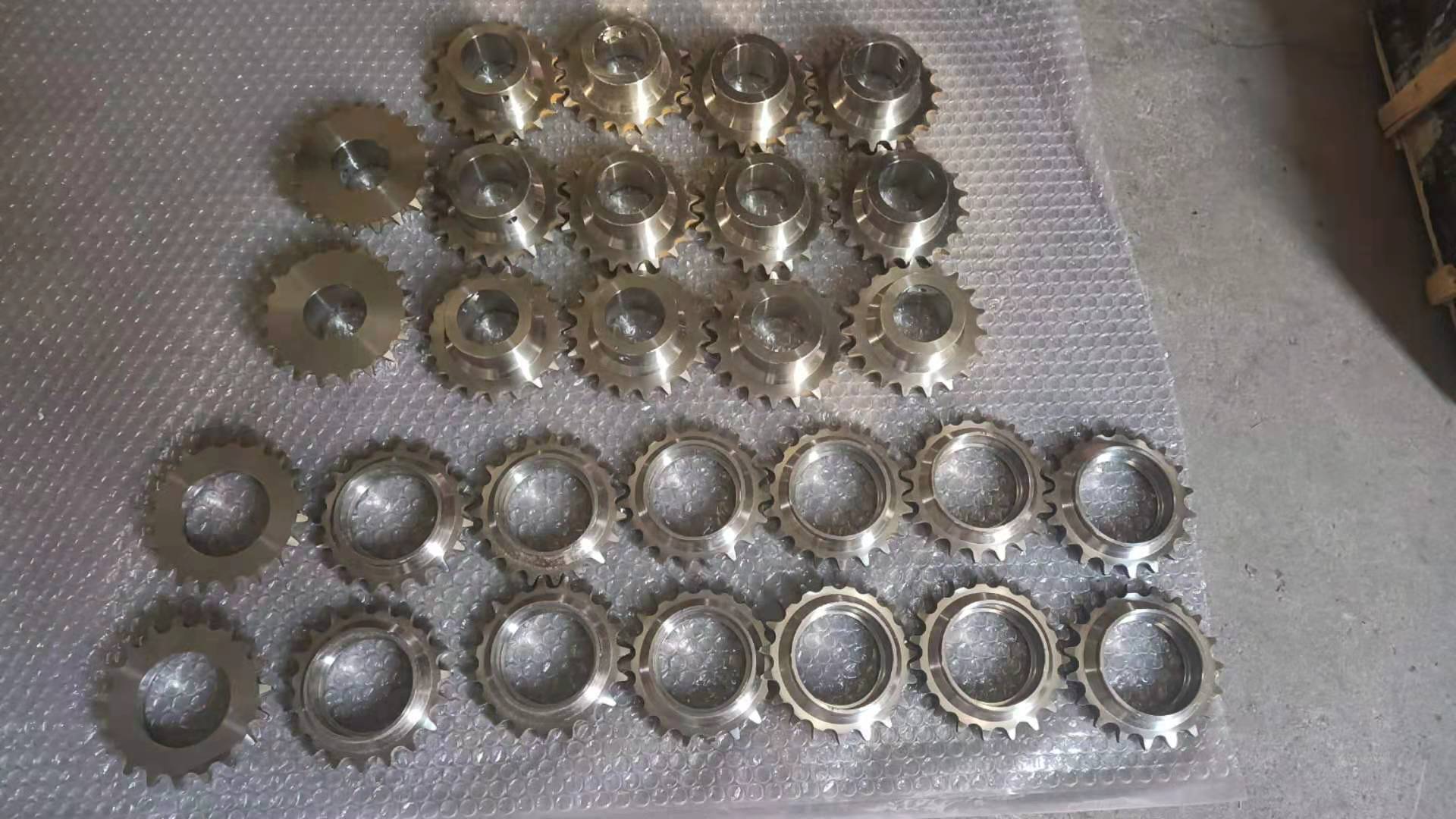 鏈輪軸面齒形兩側(cè)呈圓弧狀,以便于鏈節(jié)進入和退出嚙合。齒形用標(biāo)準(zhǔn)刀具加工時,在鏈輪工作圖上不必繪制端面齒形,但須繪出鏈輪軸面齒形,以便車削鏈輪毛壞。軸面齒形的具體尺寸見有關(guān)設(shè)計手冊。鏈輪齒應(yīng)有足夠的接觸強度和耐磨性,故齒面多經(jīng)熱處理。小鏈輪的嚙合次數(shù)比大鏈輪多,所受沖擊力也大,故所用材料一般應(yīng)優(yōu)于大鏈輪。常用的鏈輪材料有碳素鋼(如Q235、Q275、45、ZG310-570等)、灰鑄鐵(如HT200)等。重要的鏈輪可采用合金鋼。小直徑鏈輪可制成實心式;中等直徑的鏈輪可制成孔板式;直徑較大的鏈輪可設(shè)計成組合式,若輪齒因磨損而失效,可更換齒圈。